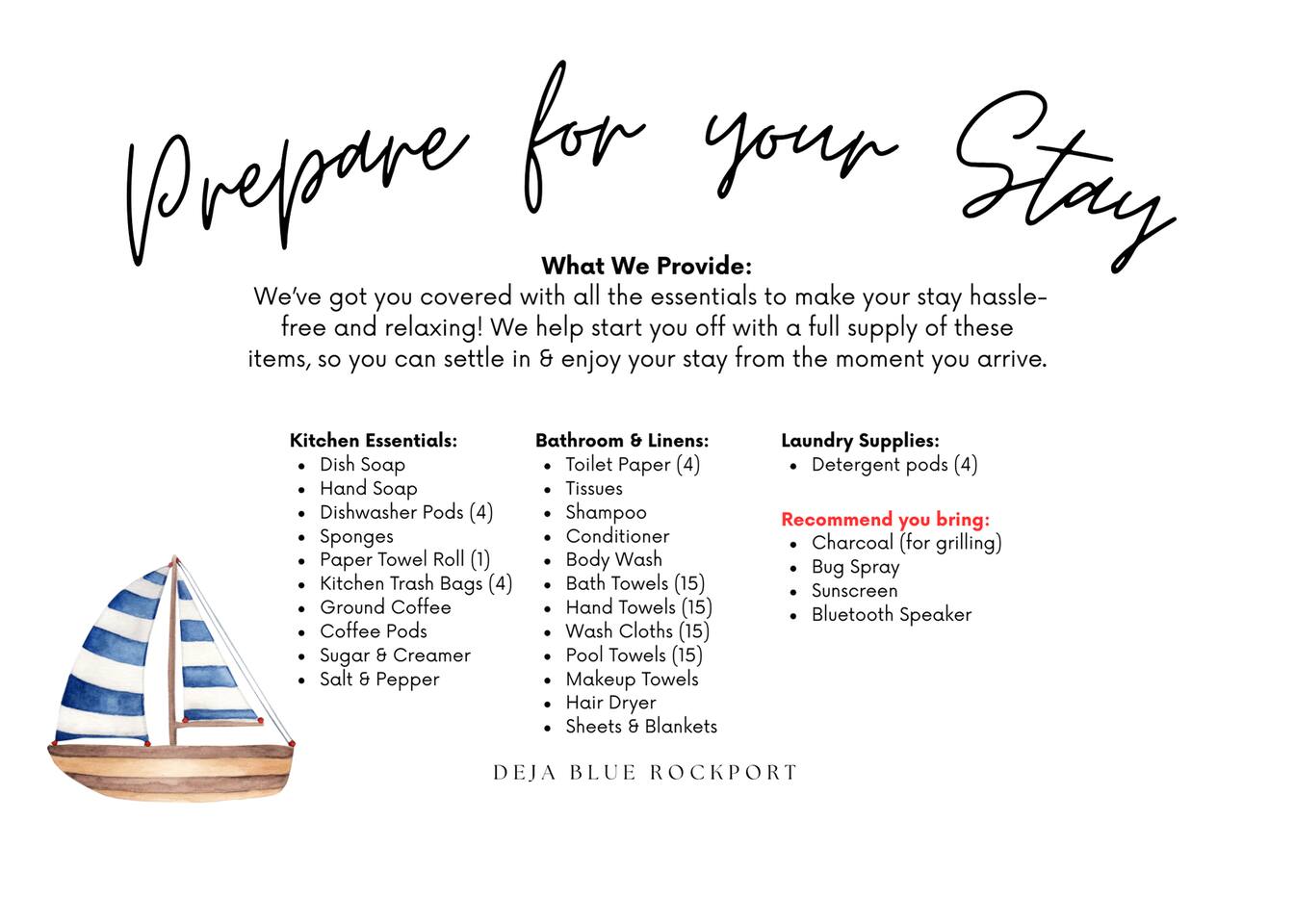 - Essentials Towels, bed sheets, soap, toilet paper, and pillows
